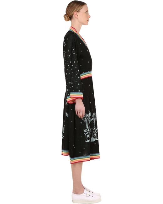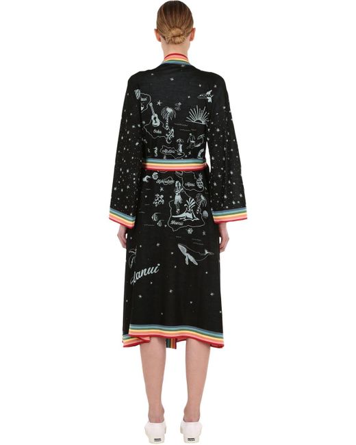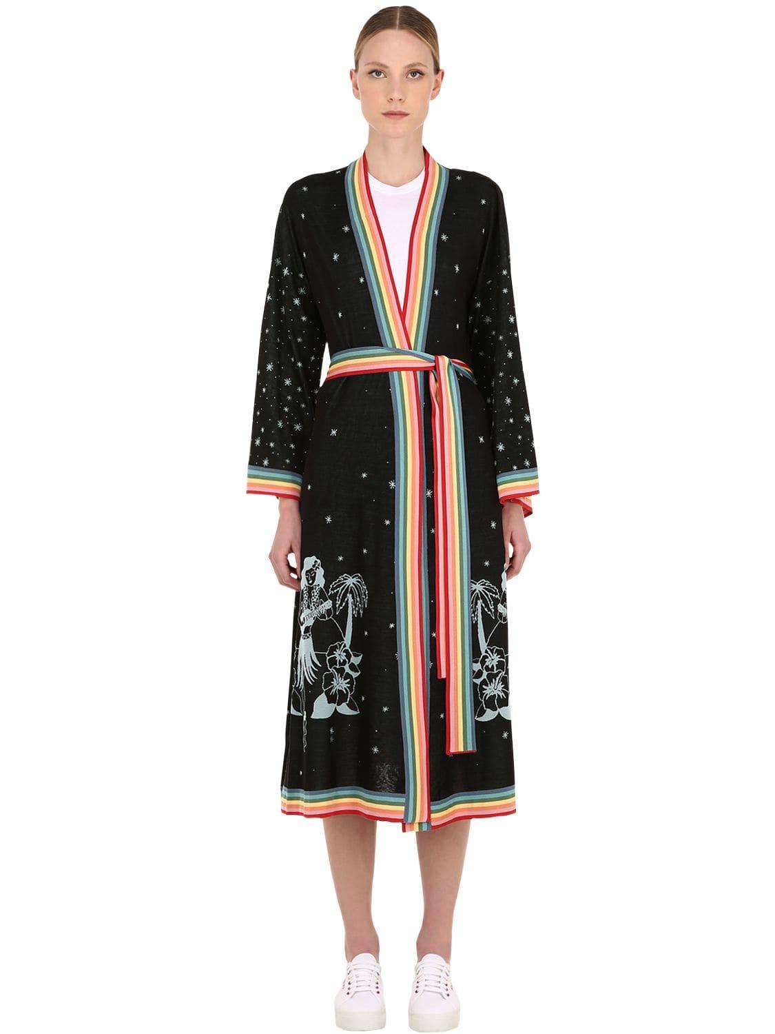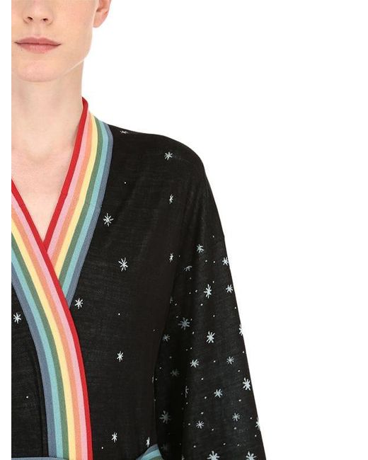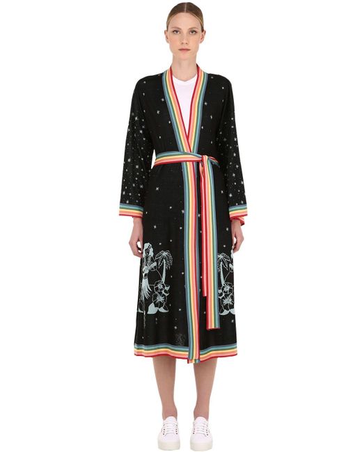 Cuello con solapas estilo esmoquin. Ribetes a rayas. Incluye cinturón combinado. La posición del estampado en la superficie puede variar ligeramente. Talla muestra: m. 100%se. Color: negro