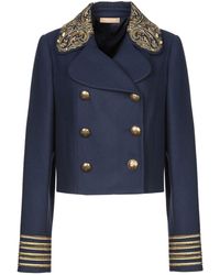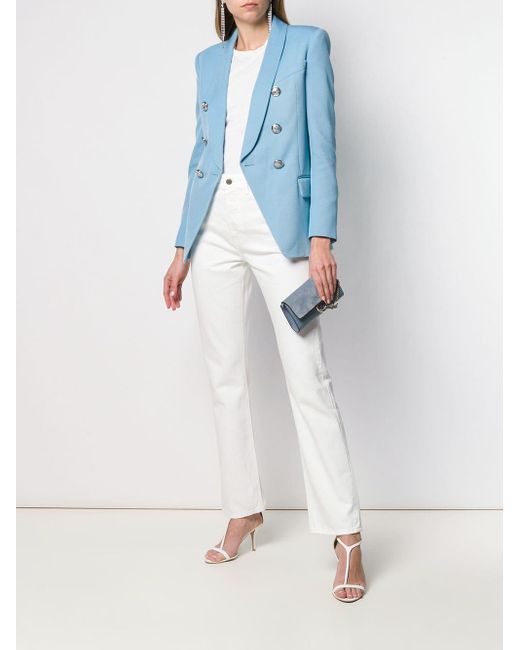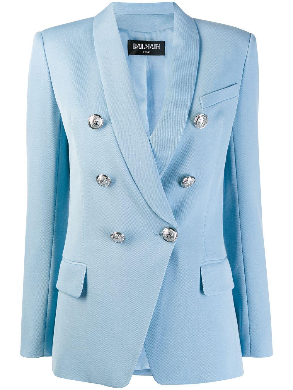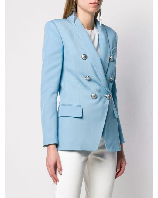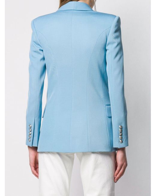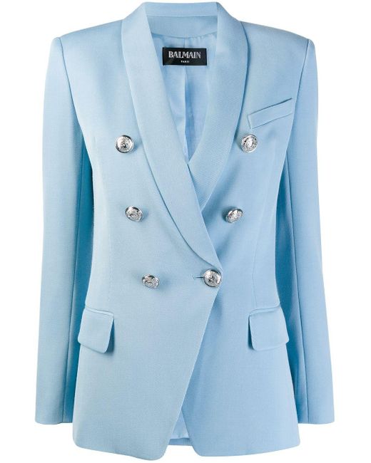 Blazer con doble botonadura de color azul de Balmain con solapa redonda, cierre con doble botonadura, bolsillo de pañuelo con ribete en el pecho, bolsillos con solapa en el frente, manga larga, puños con botón y corte ceñido. Material:lana virgen/algodón/Viscosa. Color: azul