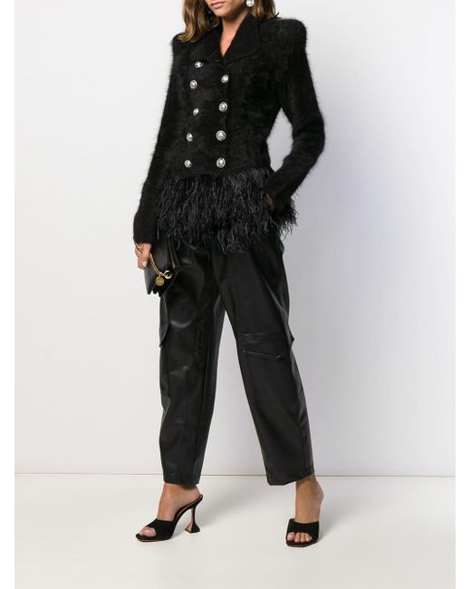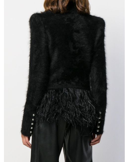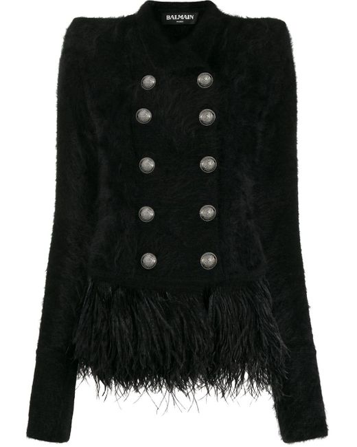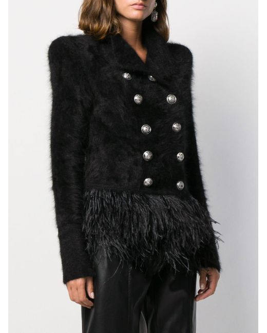 Blazer con plumas en el dobladillo de color negro de Balmain con cuello clásico, cierre con doble botonadura, estilo tubo, manga larga y puños con botón. Material:poliamida/Viscosa/angora/plumas. Color: negro