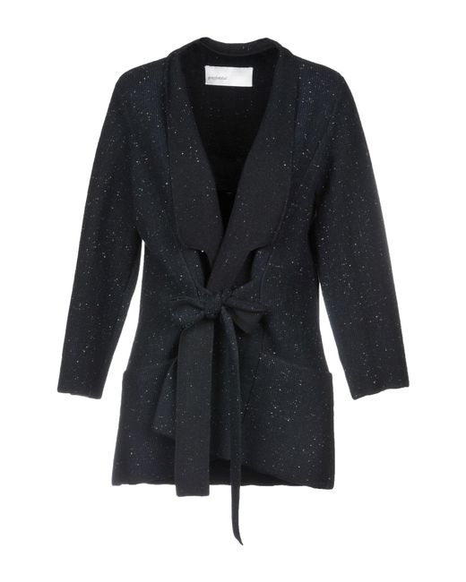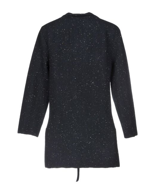 Tejido en punto, efecto entreverado, sin aplicaciones, estampado bicolor, escote profundo, punto ligero, manga larga, cierre delantero, cierre de nudo, multibolsillos. 100% Lana Virgen. Color: azul