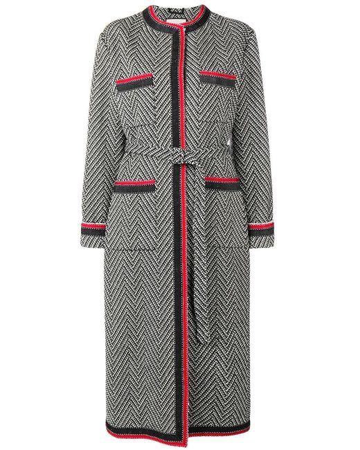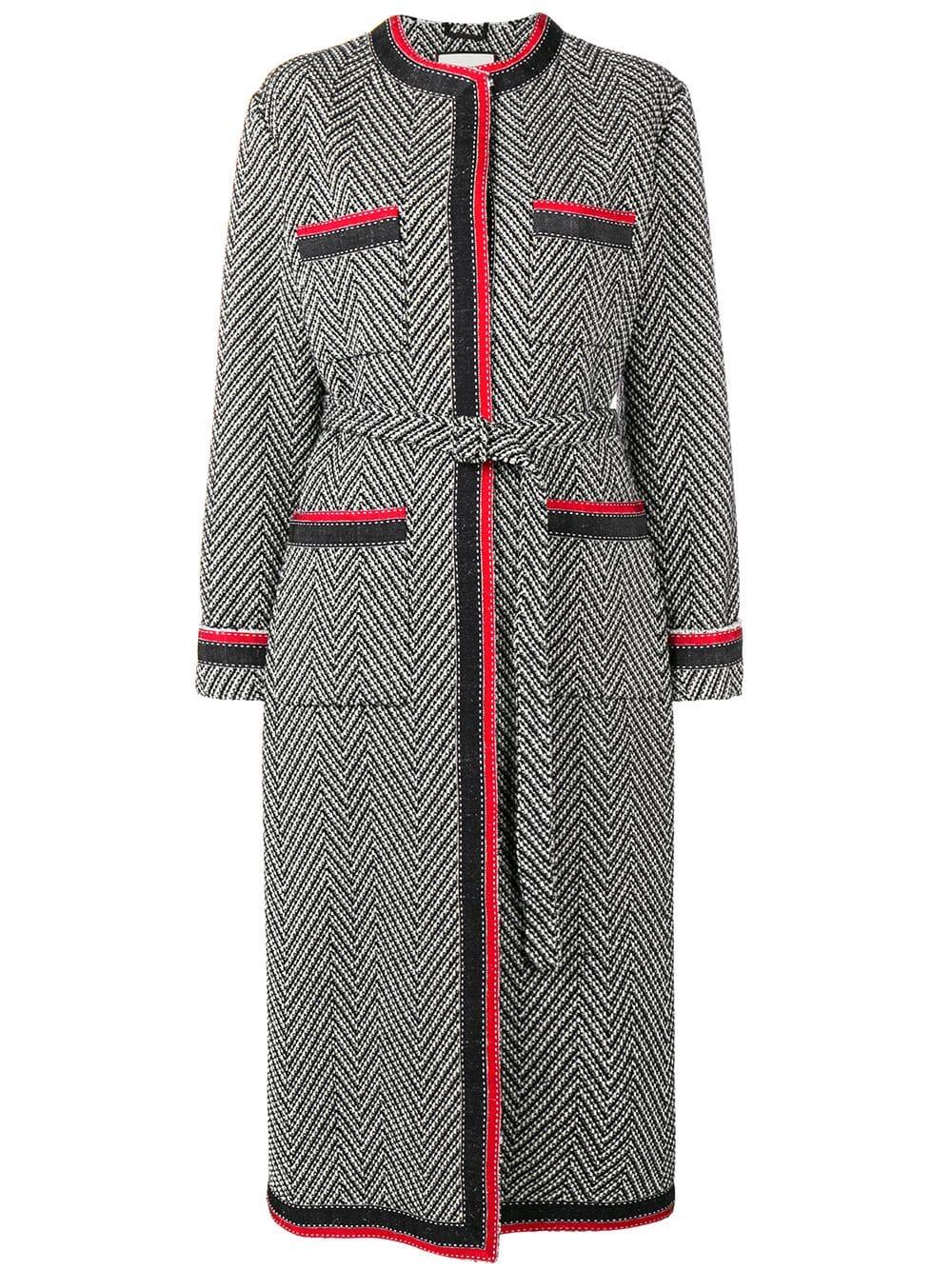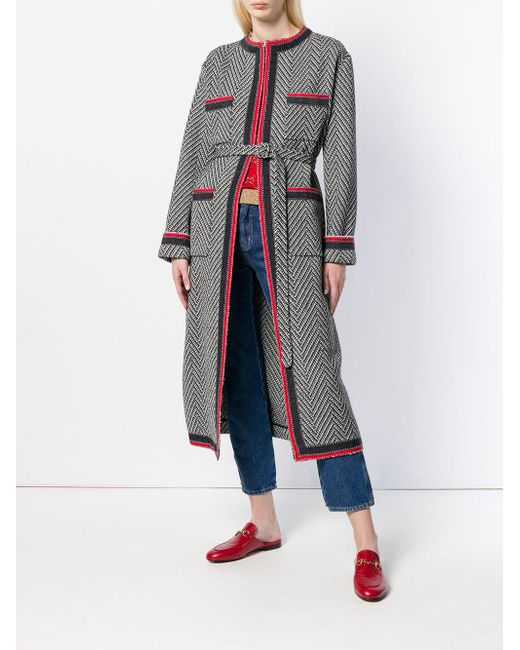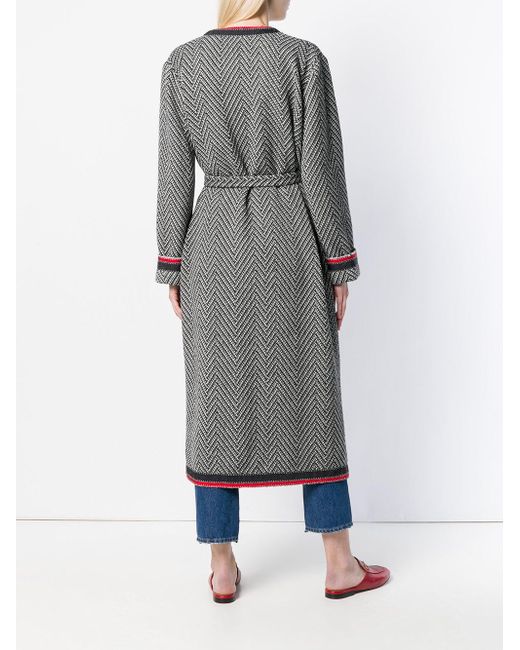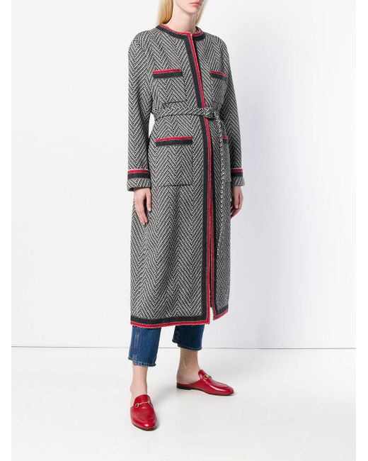 Abrigo de tweed con motivo chevron en mezcla de lana negro y blanco roto de Gucci con diseño sin cuello, cierre oculto en la parte delantera, cinturón incorporado, manga larga, bolsillos de parche, dobladillo recto y corte largo. Material:poliéster/acrílico/lana/poliamida. Color: negro
