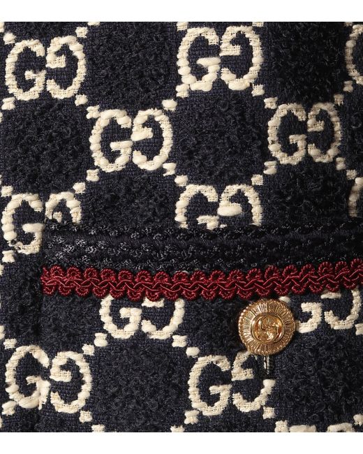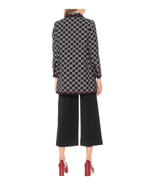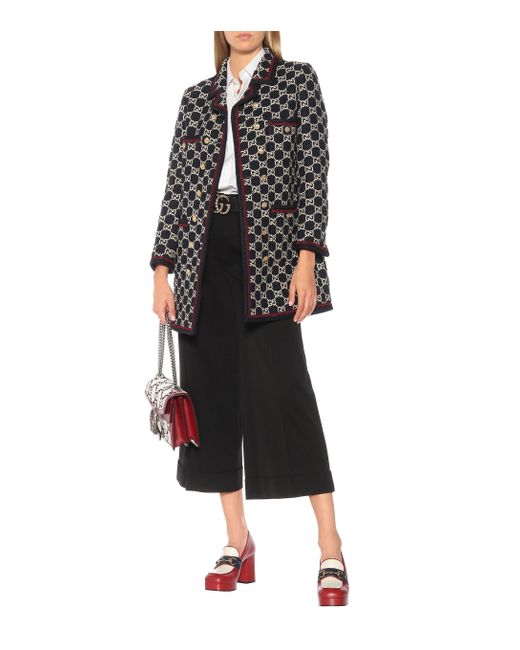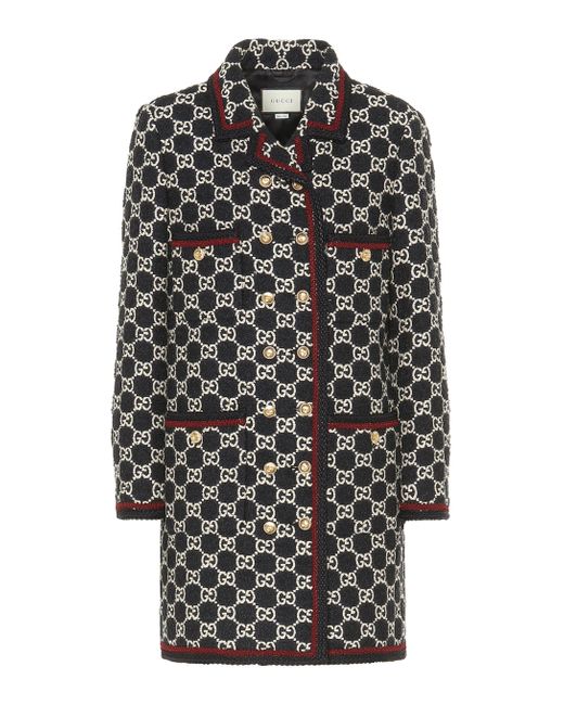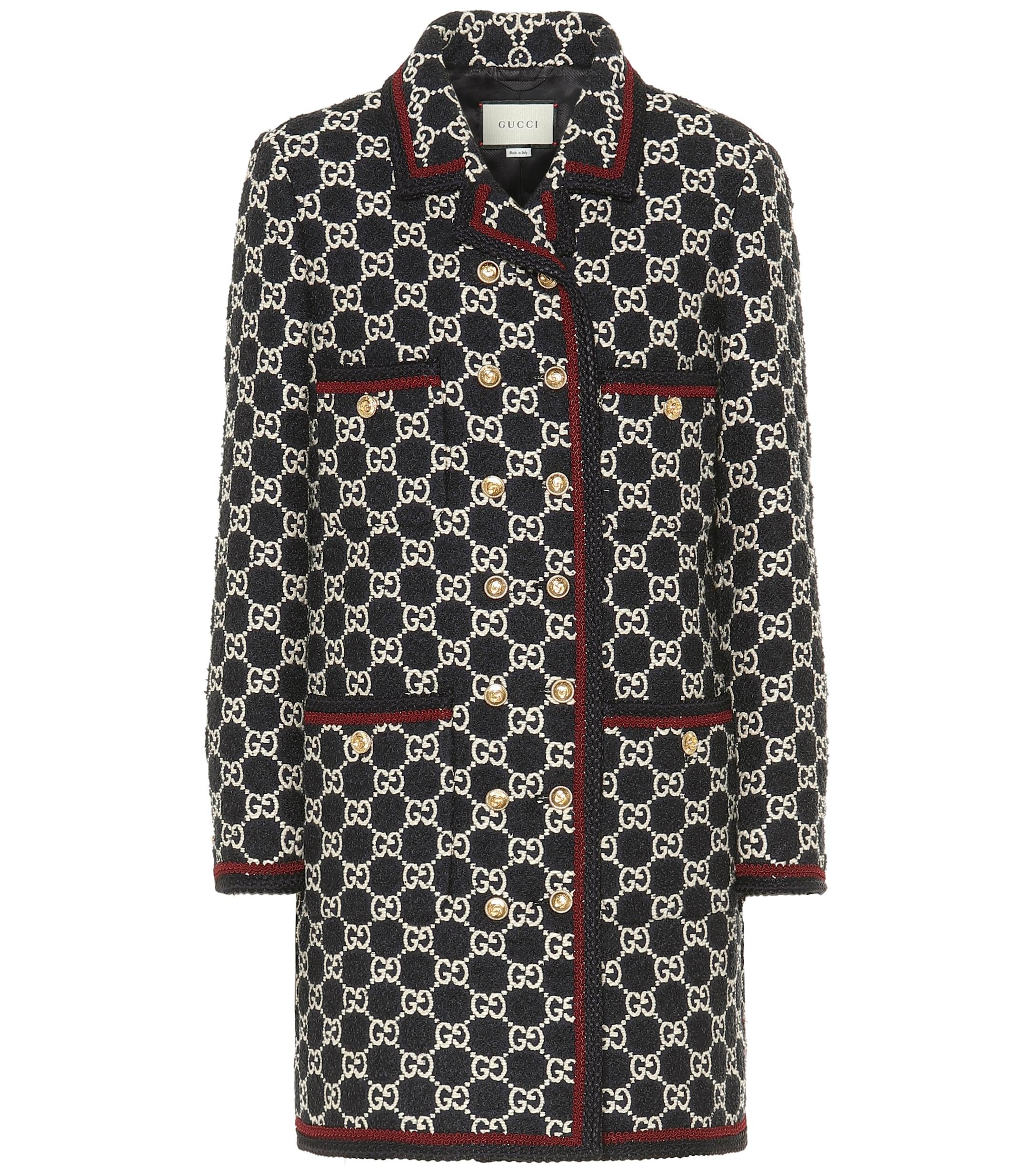 Este abrigo clásico de Gucci está hecho de tweed GG, una combinación exclusiva de algodón y lana que resalta los emblemas icónicos. Color: negro