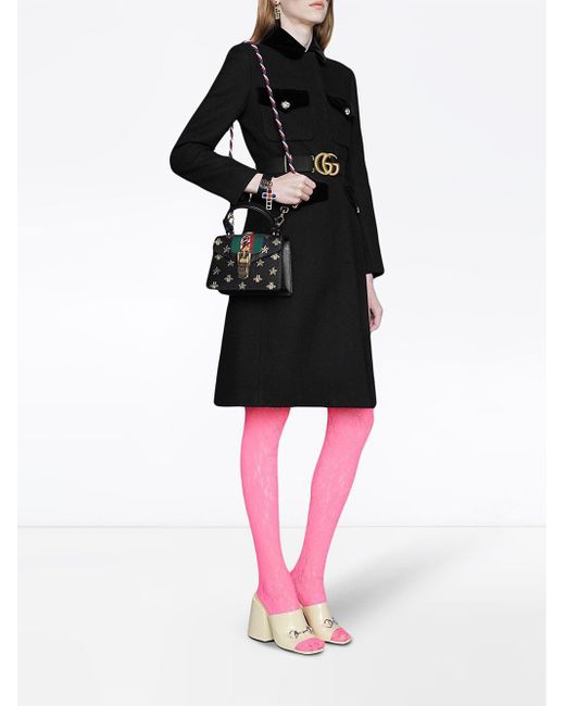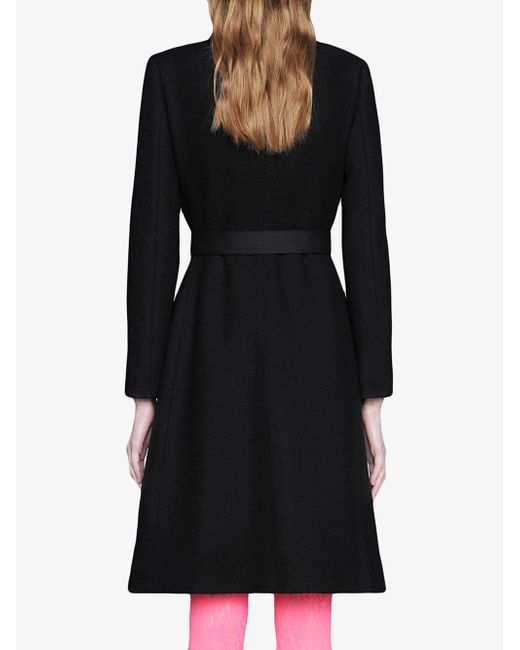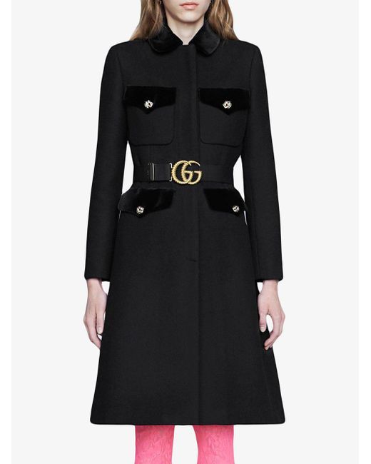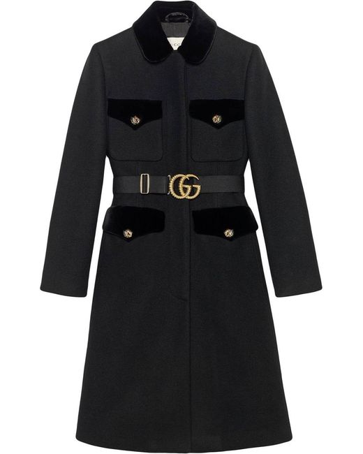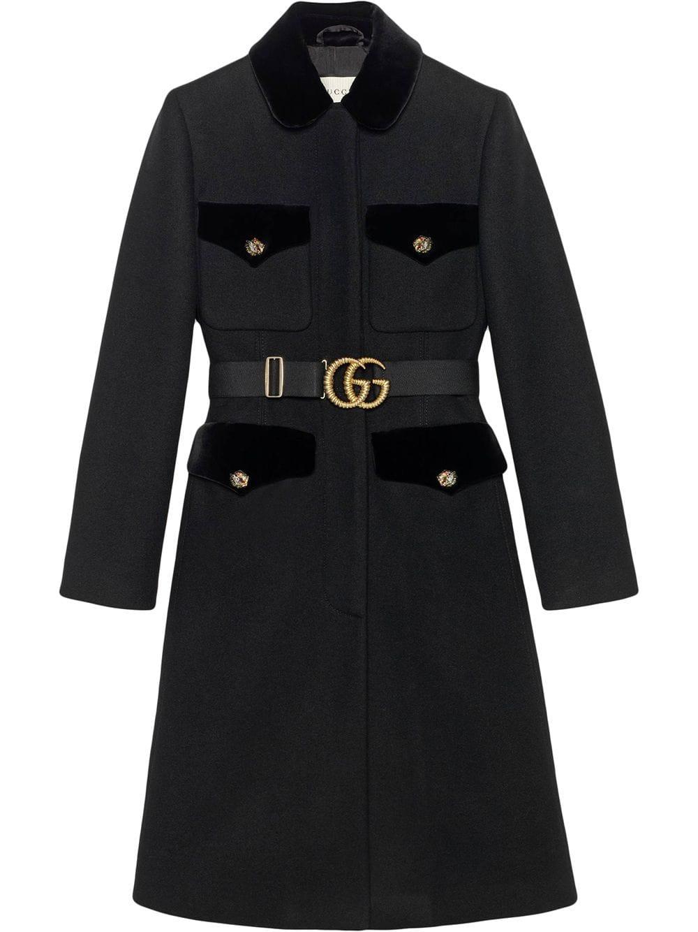 Abrigo de lana de color negro de Gucci con bolsillos con solapa, ribete de terciopelo, cinturón removible con doble G, botones con detalle de cabeza de tigre y hecho en Italia. Material:poliamida/lana/Viscosa. Color: negro
