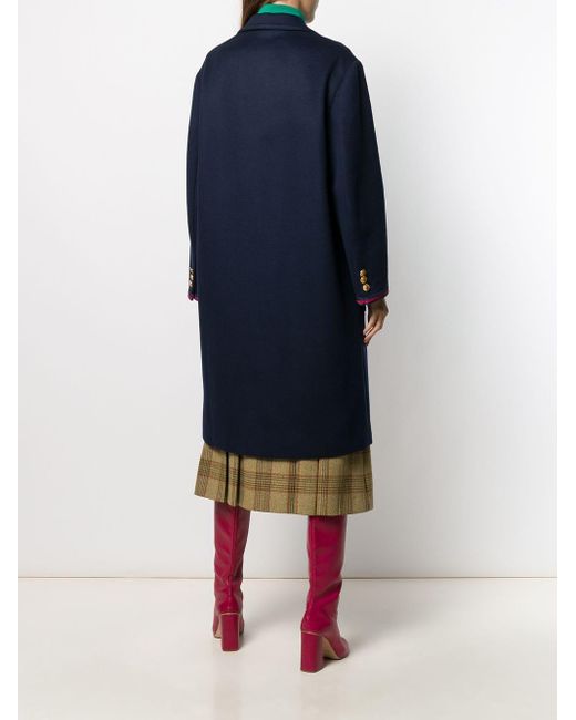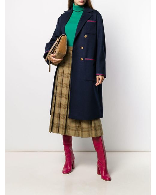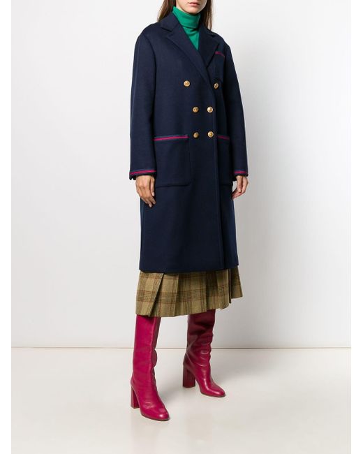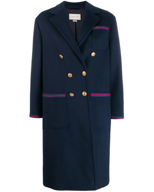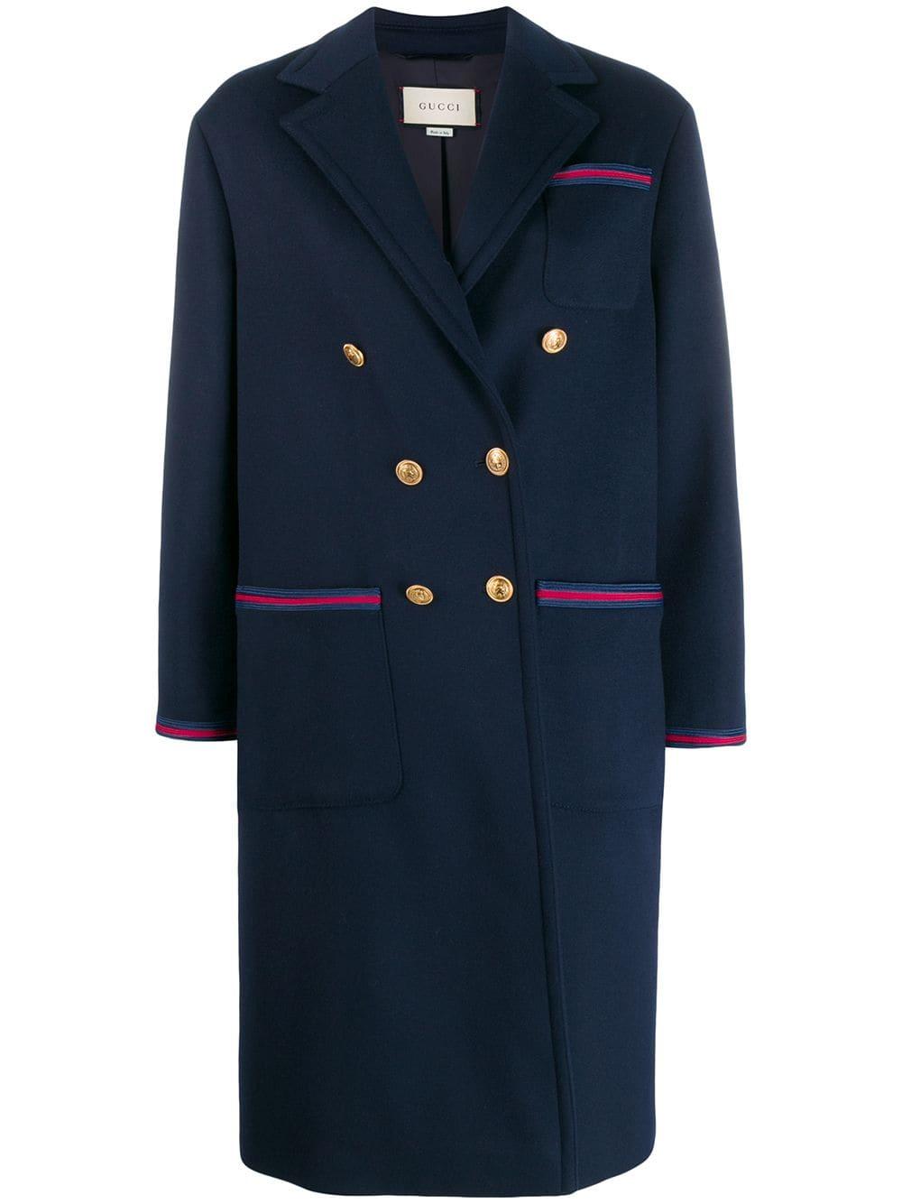 Abrigo abotonado en lana de color azul marino de Gucci con solapa de muesca, cierre con botones en la parte delantera, manga larga, bolsillos en la parte frontal, corte largo y detalle Web característico de la marca en azul y rojo. Material:algodón/poliéster/Viscosa/lana. Color: azul