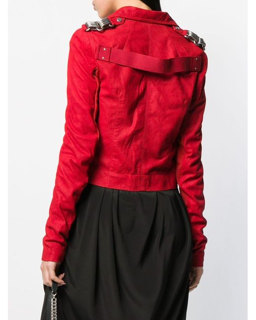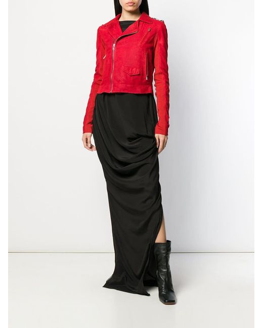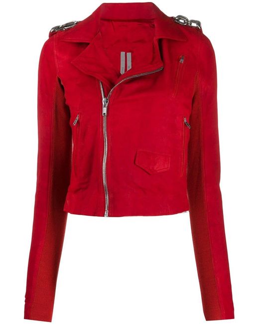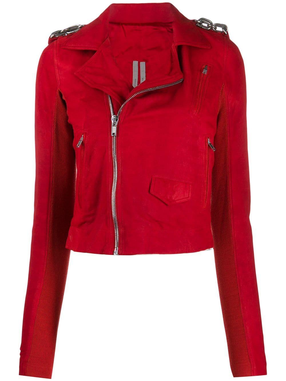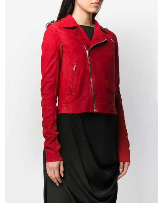 Chaqueta biker en cuero de color rojo de Rick Owens con cierre con cremallera en la parte delantera, trabillas en los hombros, bolsillos laterales con cremallera y solapa ancha. Material:algodón/piel de cordero/cupro. Color: rojo