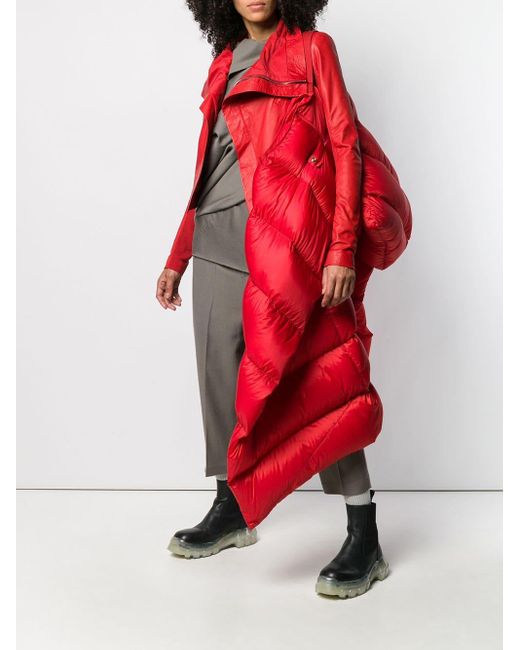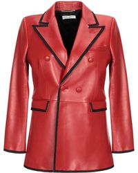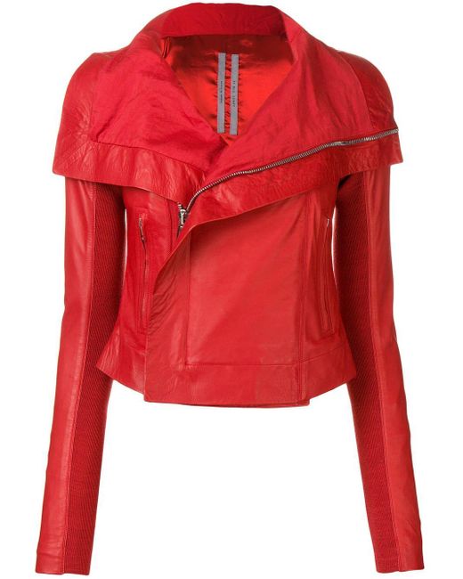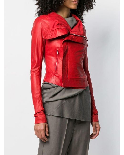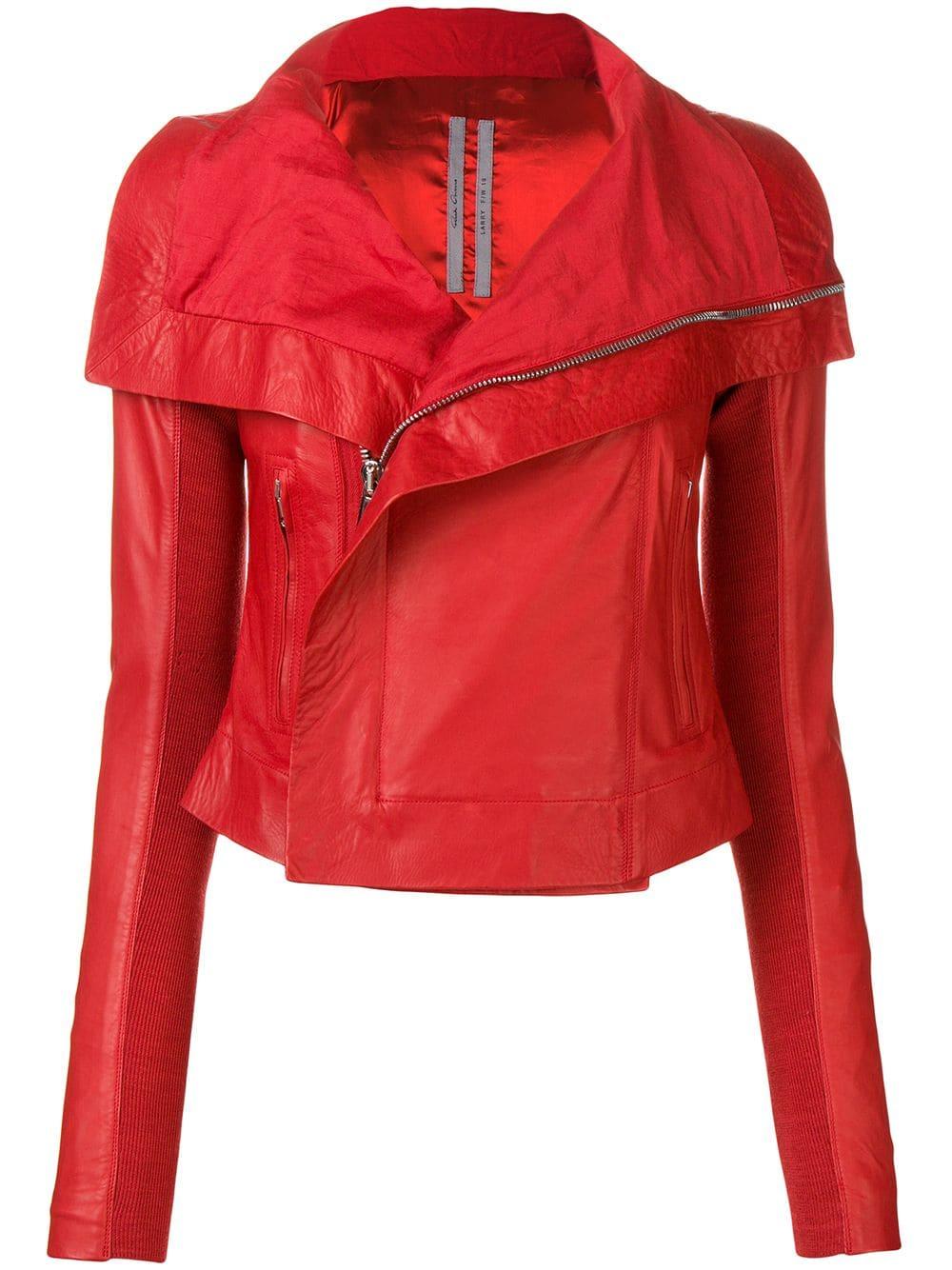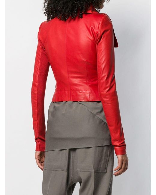 Chaqueta biker en cuero de color rojo de Rick Owens con cuello con doblez, manga larga, cierre en la parte delantera, bolsillos laterales con cierre y detalles de canalé. Material:cupro/algodón/lana virgen/piel de becerro. Color: rojo