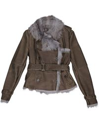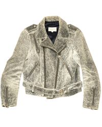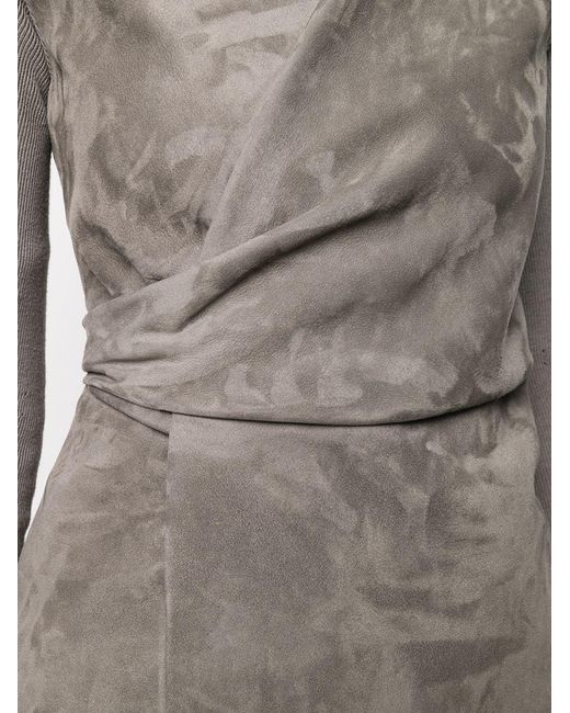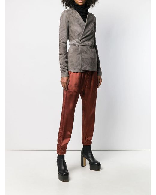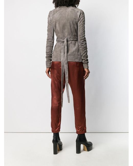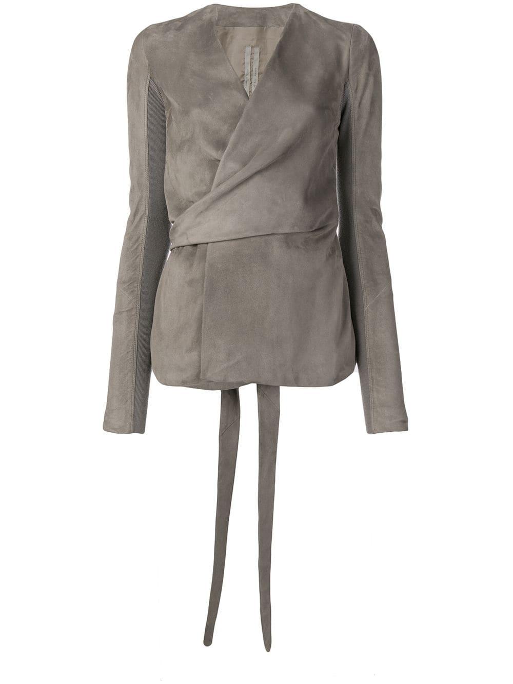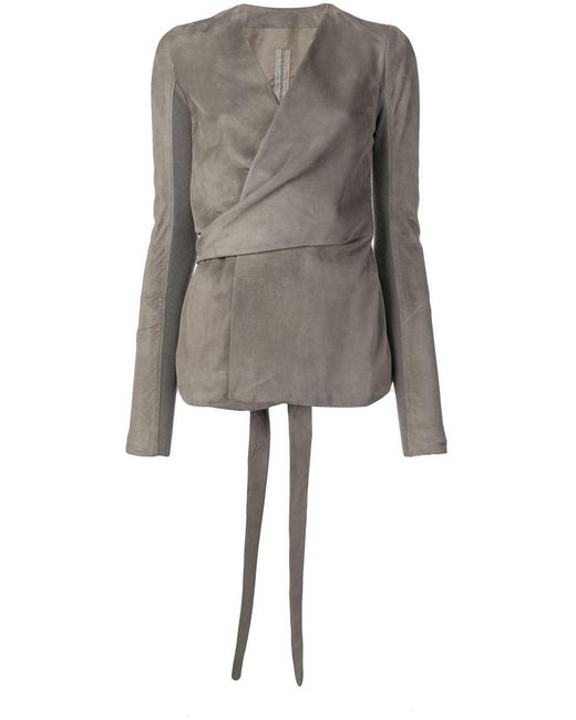Chaqueta cruzada de Rick Owens con manga larga, silueta cruzada, cuello en V, detalles de canalé, dobladillo recto y cierre con lazo. Material:lana virgen/piel de cordero/cupro/Viscosa. Color: gris