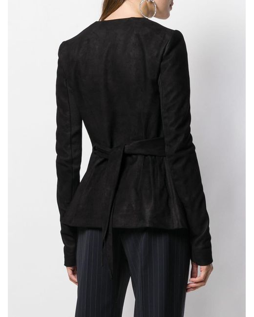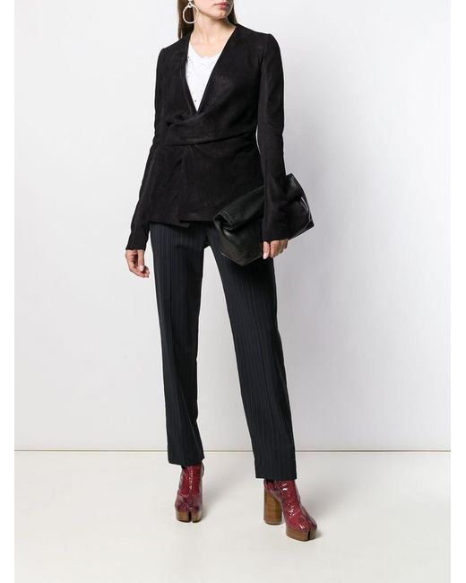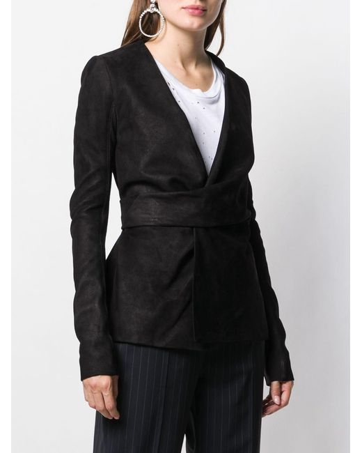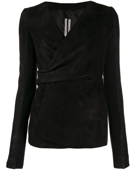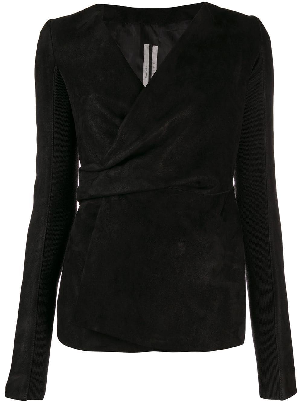 Chaqueta cruzada en el frente de color negro de Rick Owens con cuello en V, cruzado en la parte delantera, cierre con lazo en la parte de atrás, manga larga y estilo tubo. Material:cupro/lana virgen/cuero nubuck de oveja. Color: negro