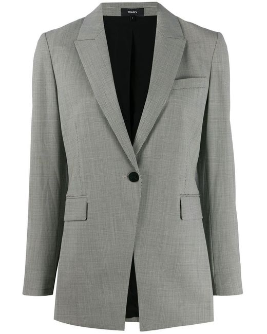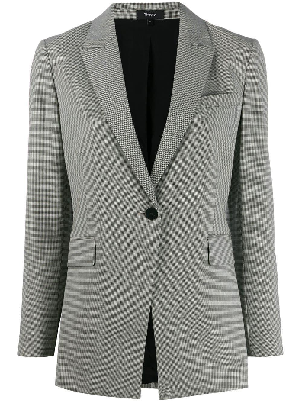 Blazer con motivo de microcuadros de Theory con solapa de muesca, cierre con botones en la parte delantera, pañuelo de bolsillo, bolsillos con solapa en el frente, manga larga, puños con botón y abertura central en la parte posterior. Material:spandex/elastano/cupro/lana. Color: negro