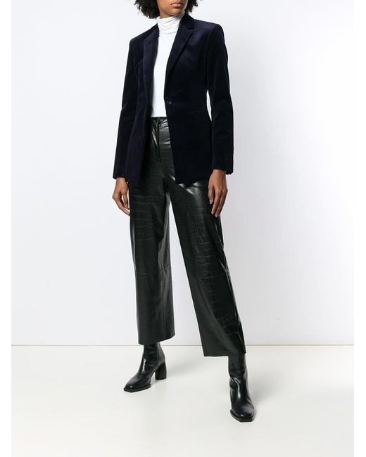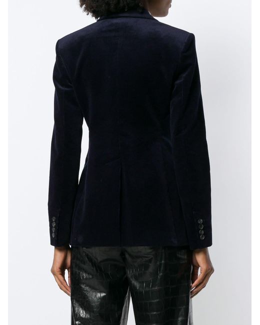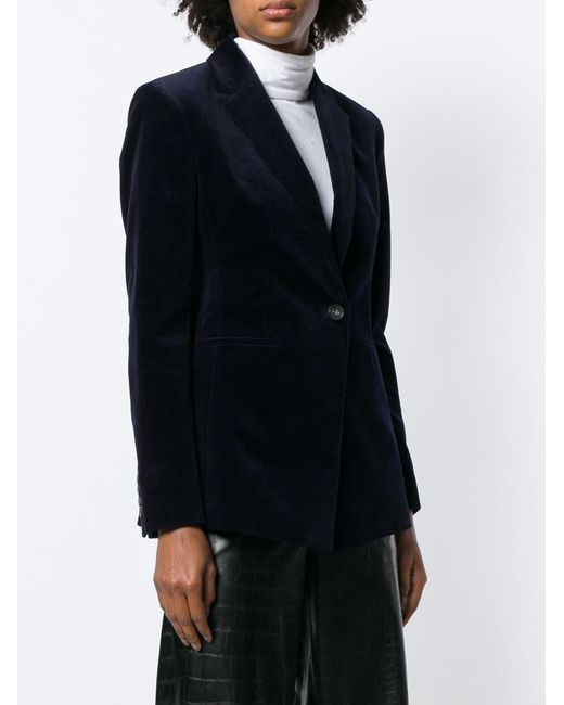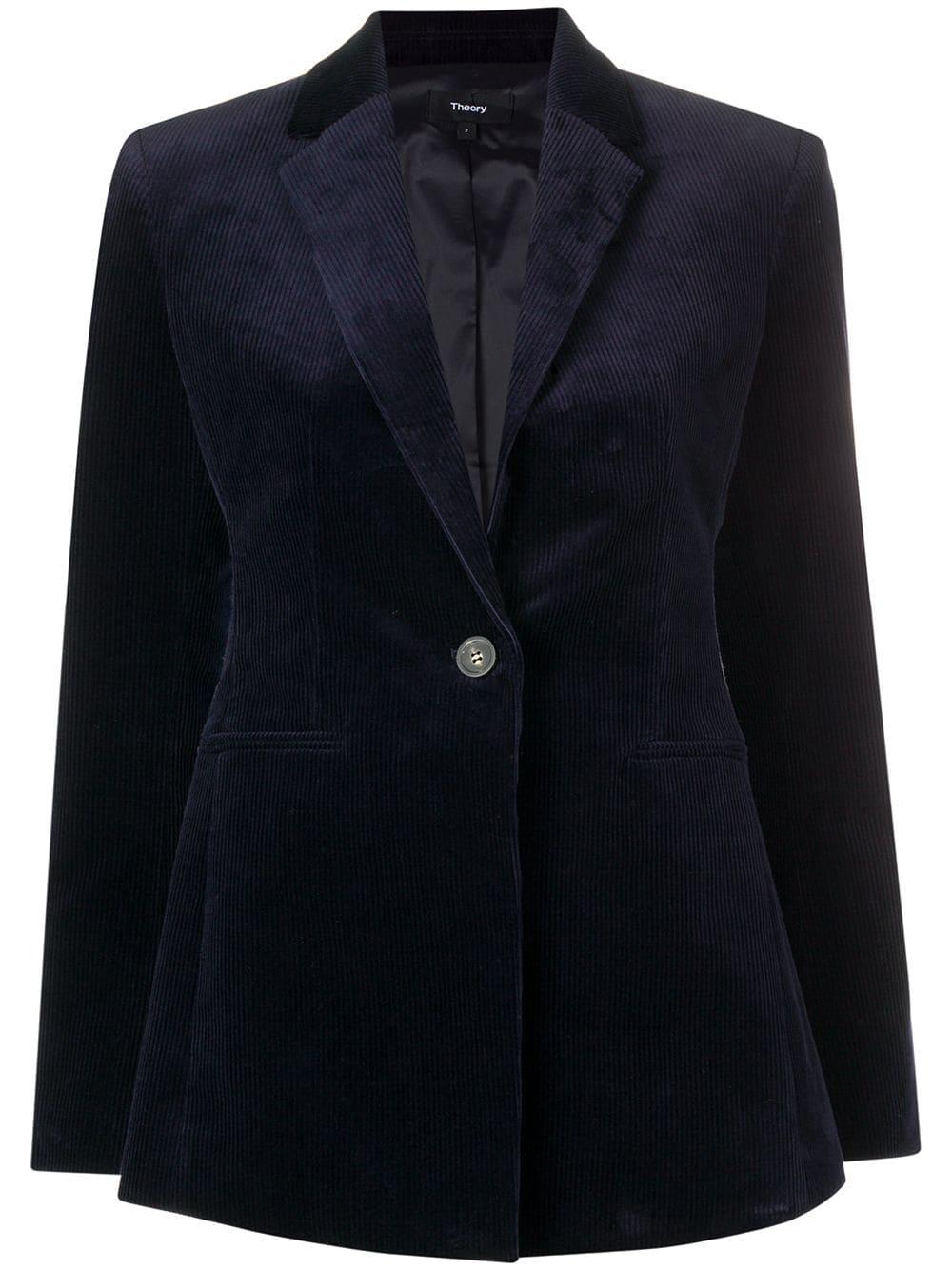 Blazer de canalé en algodón de color azul marino oscuro de Theory con solapa de muesca, cierre con botones en la parte delantera, dos bolsillos en la parte frontal, manga larga, puños con botón y abertura en la parte posterior. Material:Poliéster/Algodón/Spandex/Elastano.