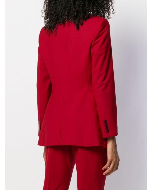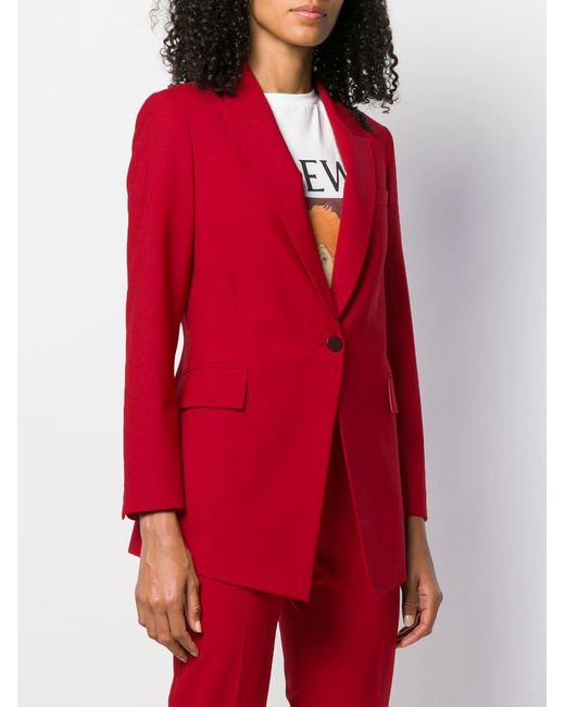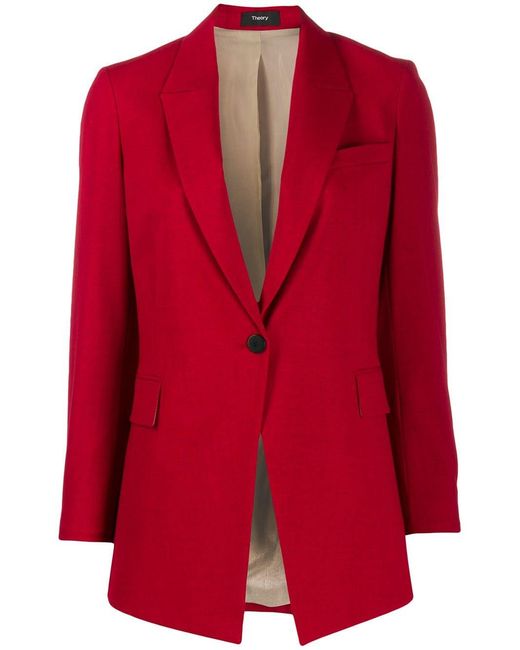 Blazer largo de color rojo de Theory con solapas de pico, bolsillo en el pecho, bolsillos con solapa en el frente, cierre con botones en la parte delantera, abertura central en la parte posterior y forro completo. Material:spandex/elastano/cupro/lana. Color: rojo