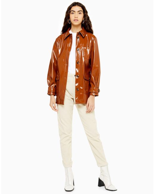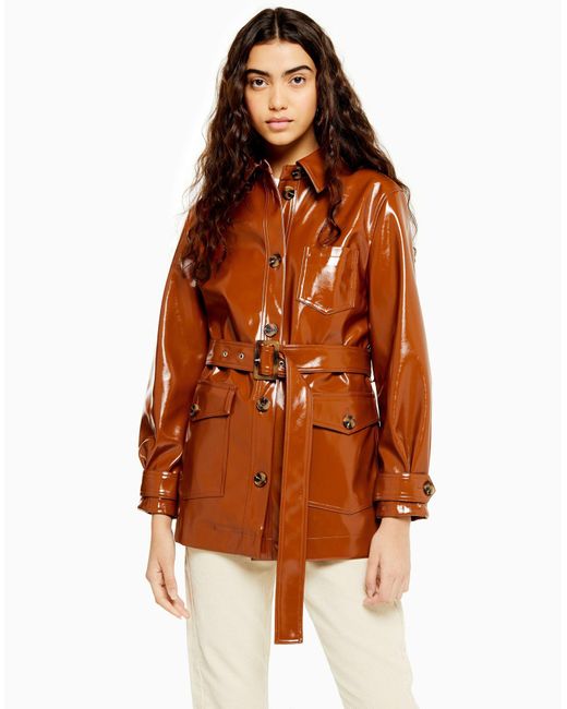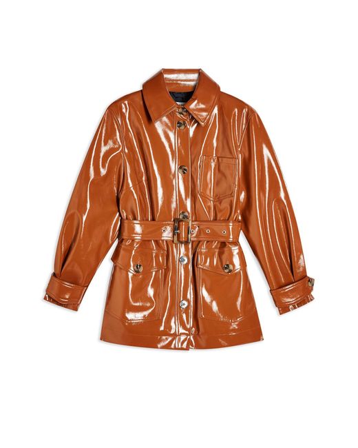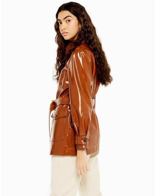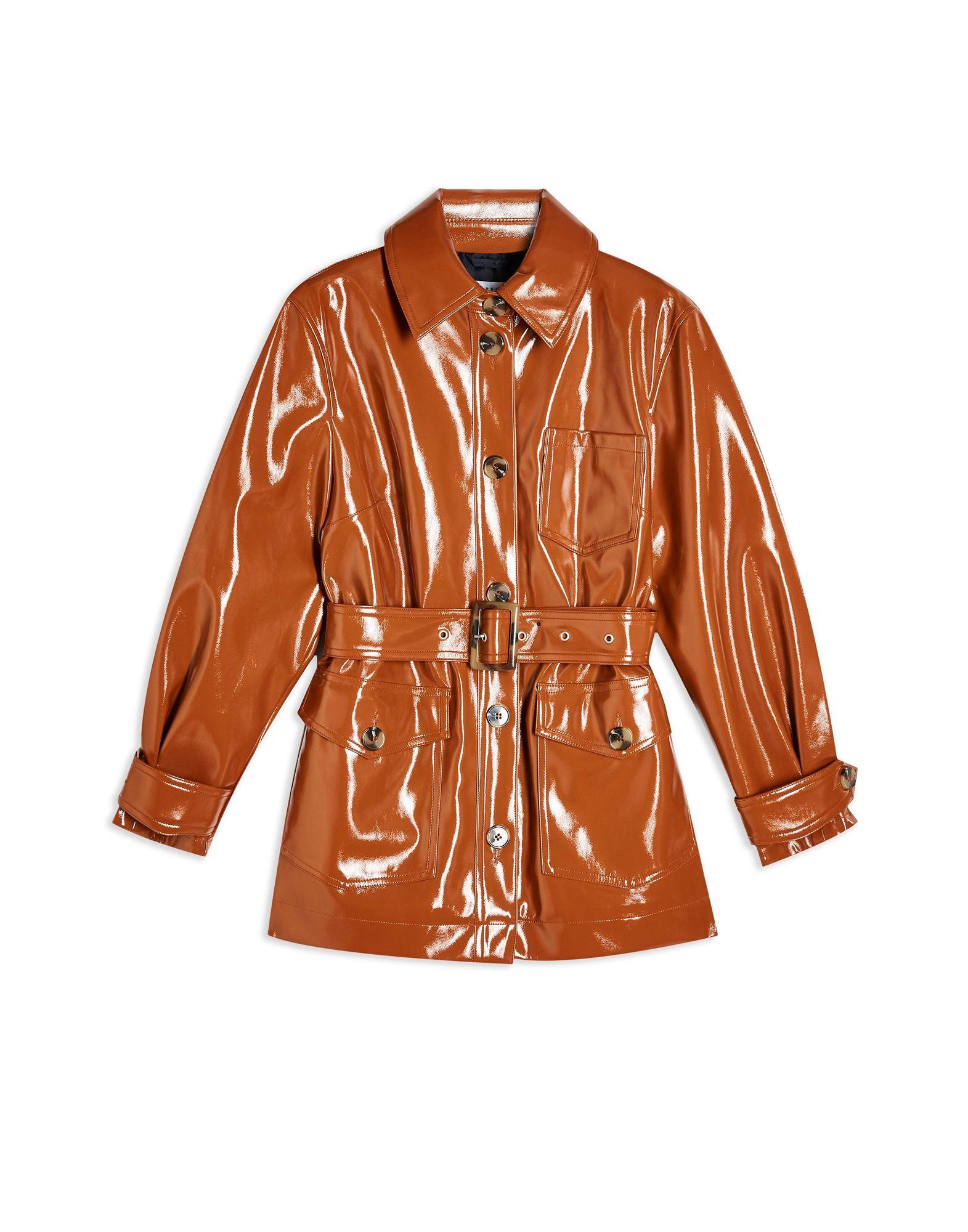 Piel de imitación, efecto lacado, cinturón, monocolor básico, abotonadura simple, cierre con botones, cuello clásico, multibolsillos , manga larga, puños con un botón , interior forrado. 100% Poliuretano. Color: marrón