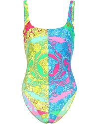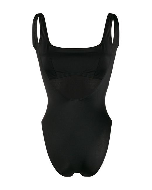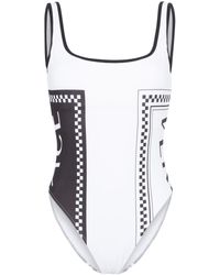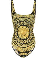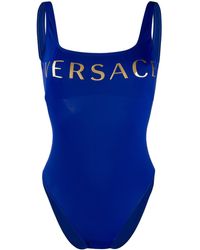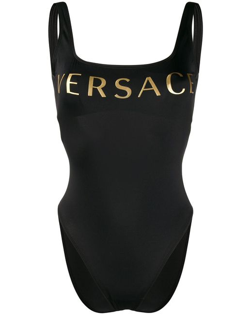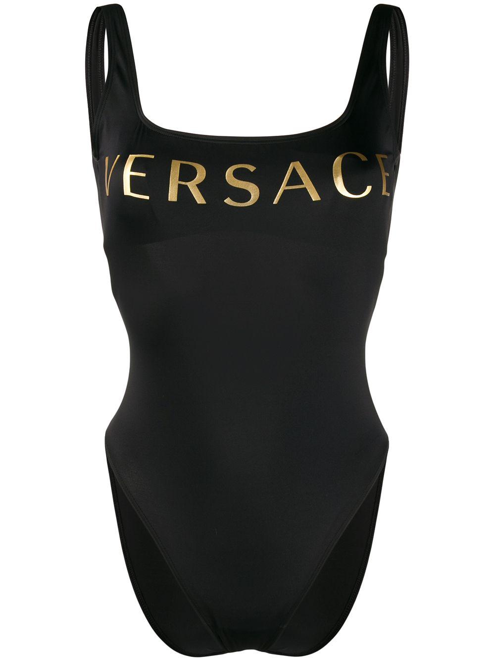 Bañador con logo estampado de color negro de Versace con cuello cuadrado, tiras en los hombros, logo estampado en la parte delantera, escote en la espalda y corte ceñido. La ropa de baño debe ser probada sobre tus prendas. Color: negro